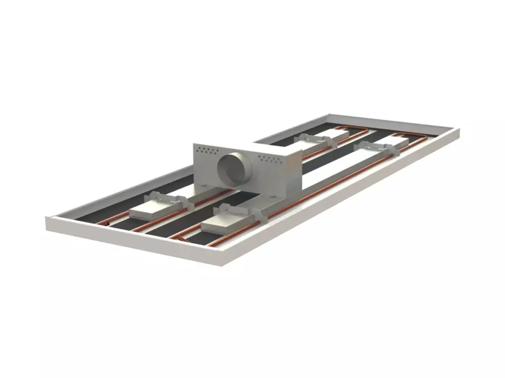 Základ tvoří sálavý panel napojený na vodní okruh. Při chlazení absorbuje teplo z interiéru přes povrch panelu a odvádí ho do cirkulující vody. Při vytápění dochází k opačnému procesu, kdy panel teplo vyzařuje zpět do prostoru. Aktivní plocha stropu umožňuje stabilní přenos energie bez výrazných teplotních výkyvů.
